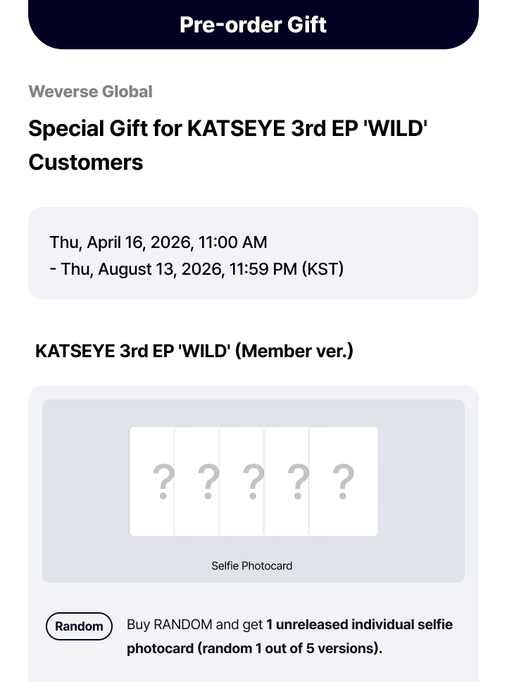 🎁POB Weverse Shop: 1 unreleased individual selfie photocard (random 1 out of 5 versions).